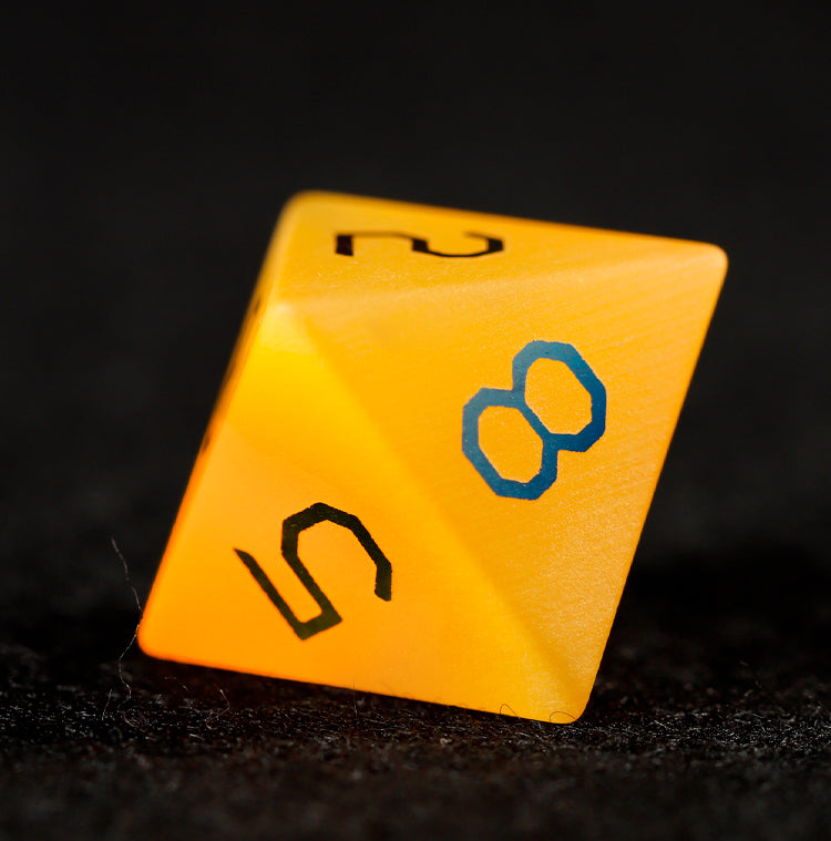 Rayonnant et vigilant, chaleureux et perspicace, et sublimé par un placage éclatant, le jeu de 7 dés polyédriques Œil de Chat Doré incarne la fortune, la perspicacité et une clairvoyance éclairée. Chaque dé présente des panneaux œil-de-chat dorés lumineux, rehaussés d'une finition électroplaquée polie, évoquant la lumière changeante du soleil, des lueurs prophétiques et le regard vigilant des voyants qui lisent le destin à chaque lancer.
