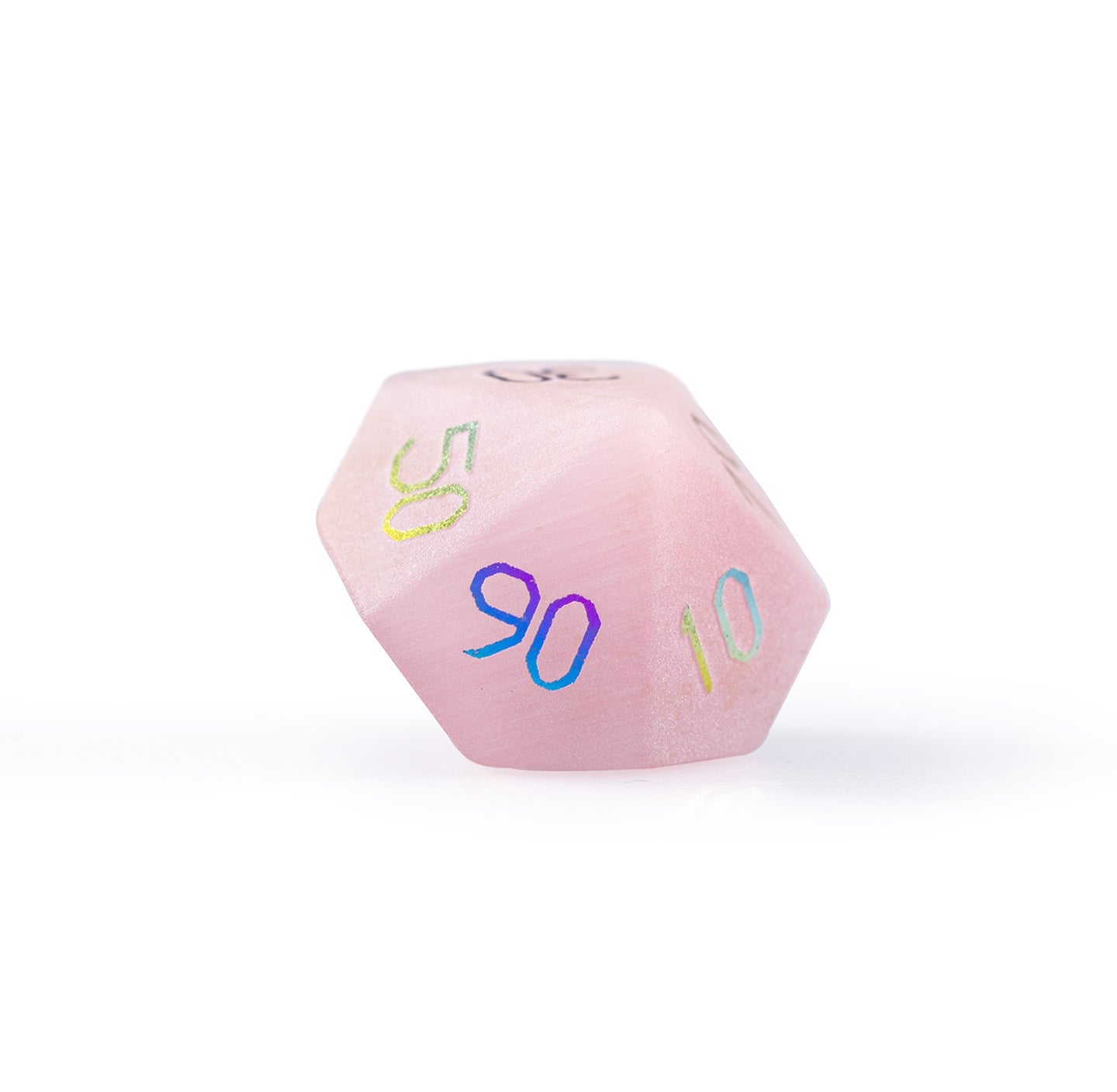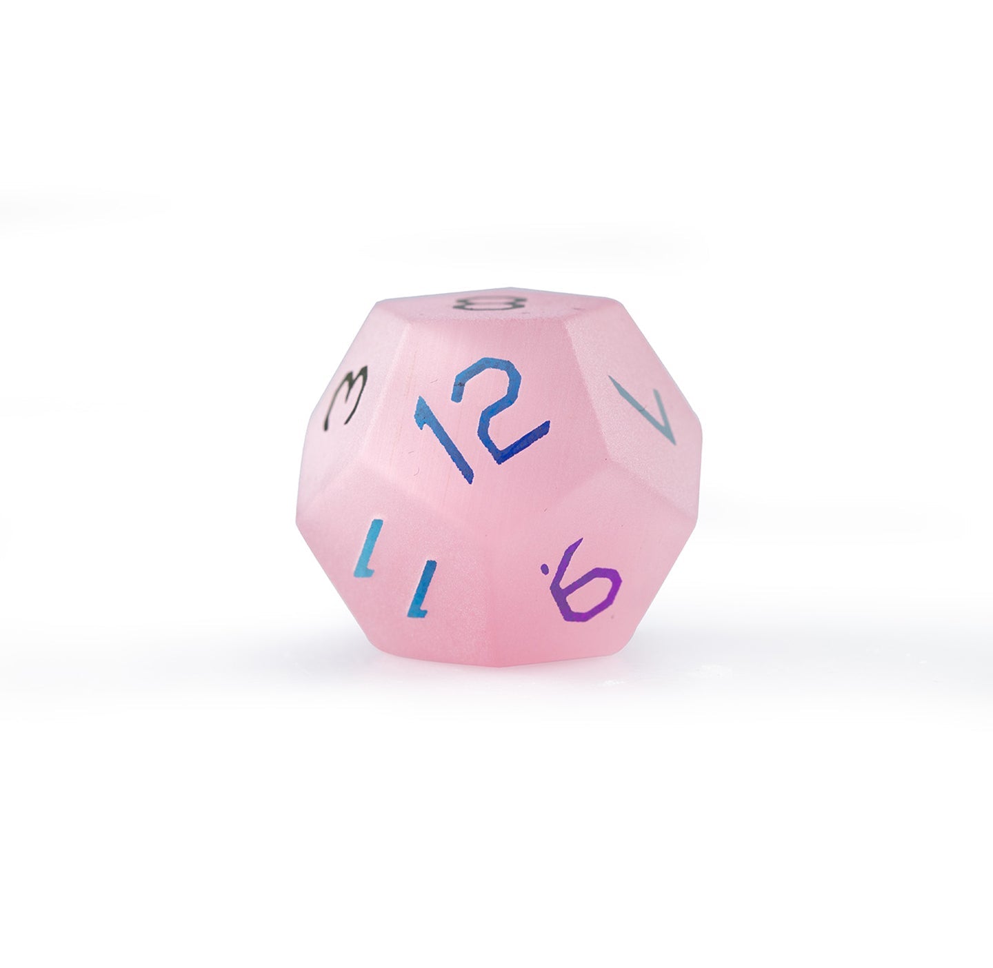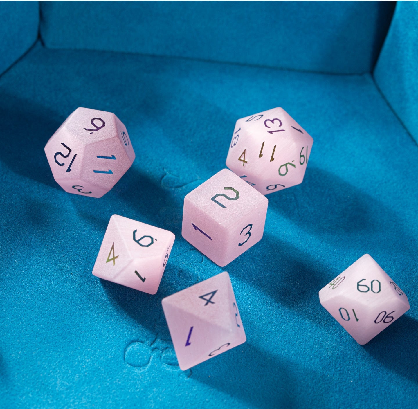 柔らかでありながら魅惑的で、明るくも捉えどころがなく、まばゆいばかりの輝きを放つメッキ仕上げのピンクキャッツアイ 7ピース ポリヘドラルダイスセットは、魅力、直感、そして流れるような魔法のエネルギーを体現しています。それぞれのダイスは、光沢のある電気メッキ仕上げでさらに美しく輝くピンクのキャッツアイパネルを備え、転がるたびに移り変わる光の帯、優しい魅力、そして神秘的な仲間たちの見守る視線を想起させます。
