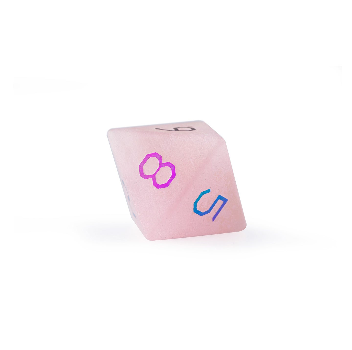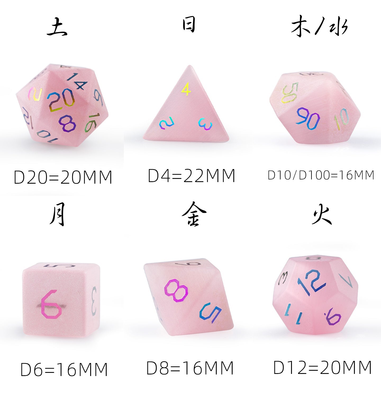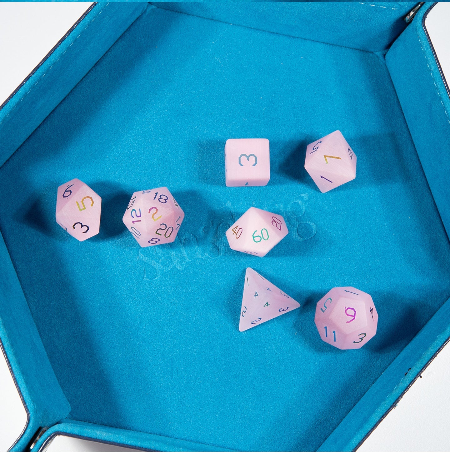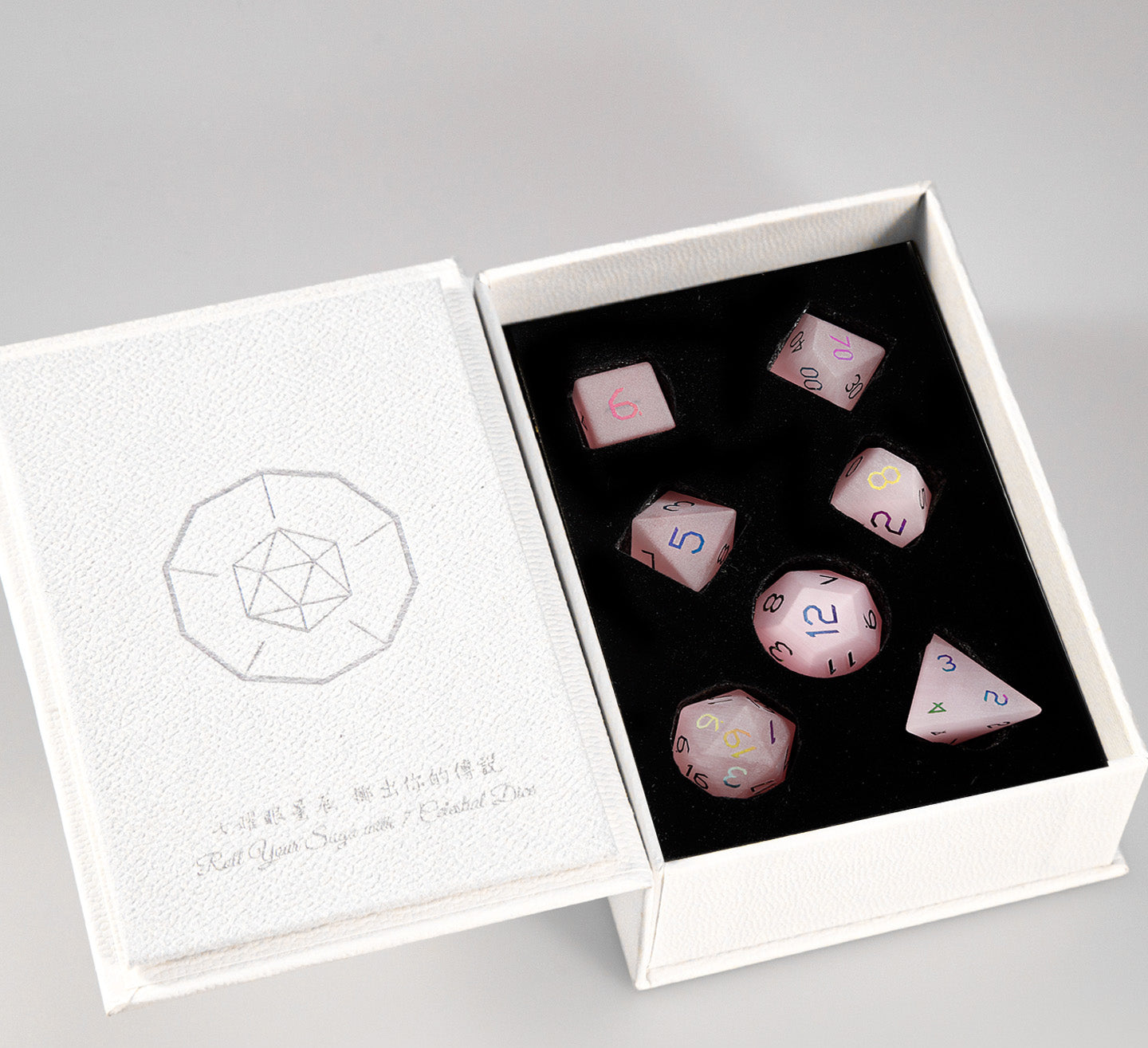 柔らかでありながら魅惑的で、明るくも捉えどころがなく、まばゆいばかりの輝きを放つメッキ仕上げのピンクキャッツアイ 7ピース ポリヘドラルダイスセットは、魅力、直感、そして流れるような魔法のエネルギーを体現しています。それぞれのダイスは、光沢のある電気メッキ仕上げでさらに美しく輝くピンクのキャッツアイパネルを備え、転がるたびに移り変わる光の帯、優しい魅力、そして神秘的な仲間たちの見守る視線を想起させます。