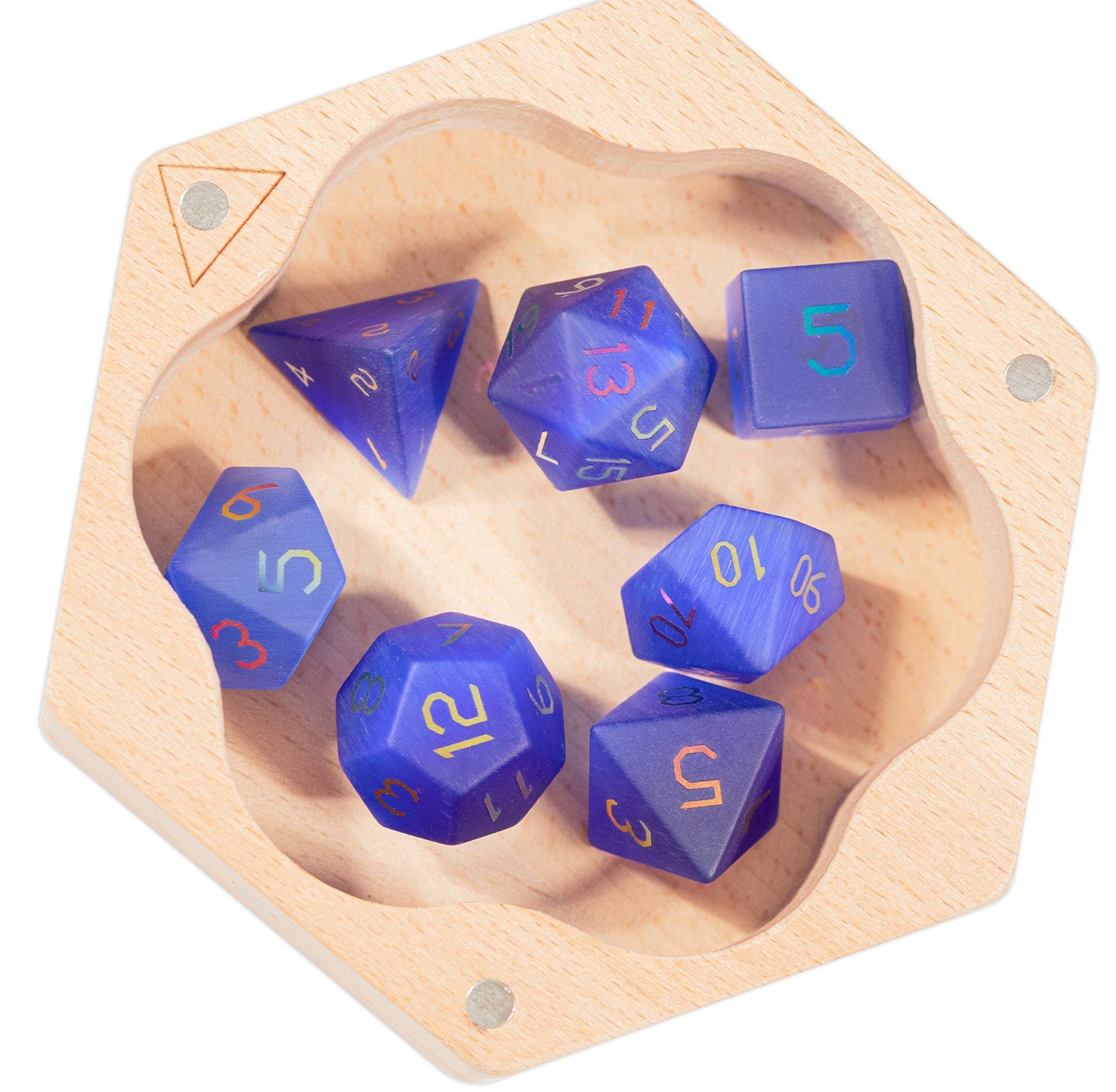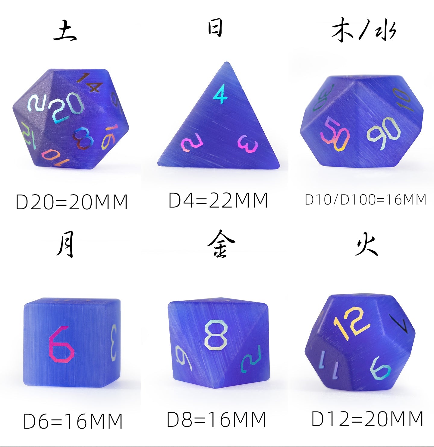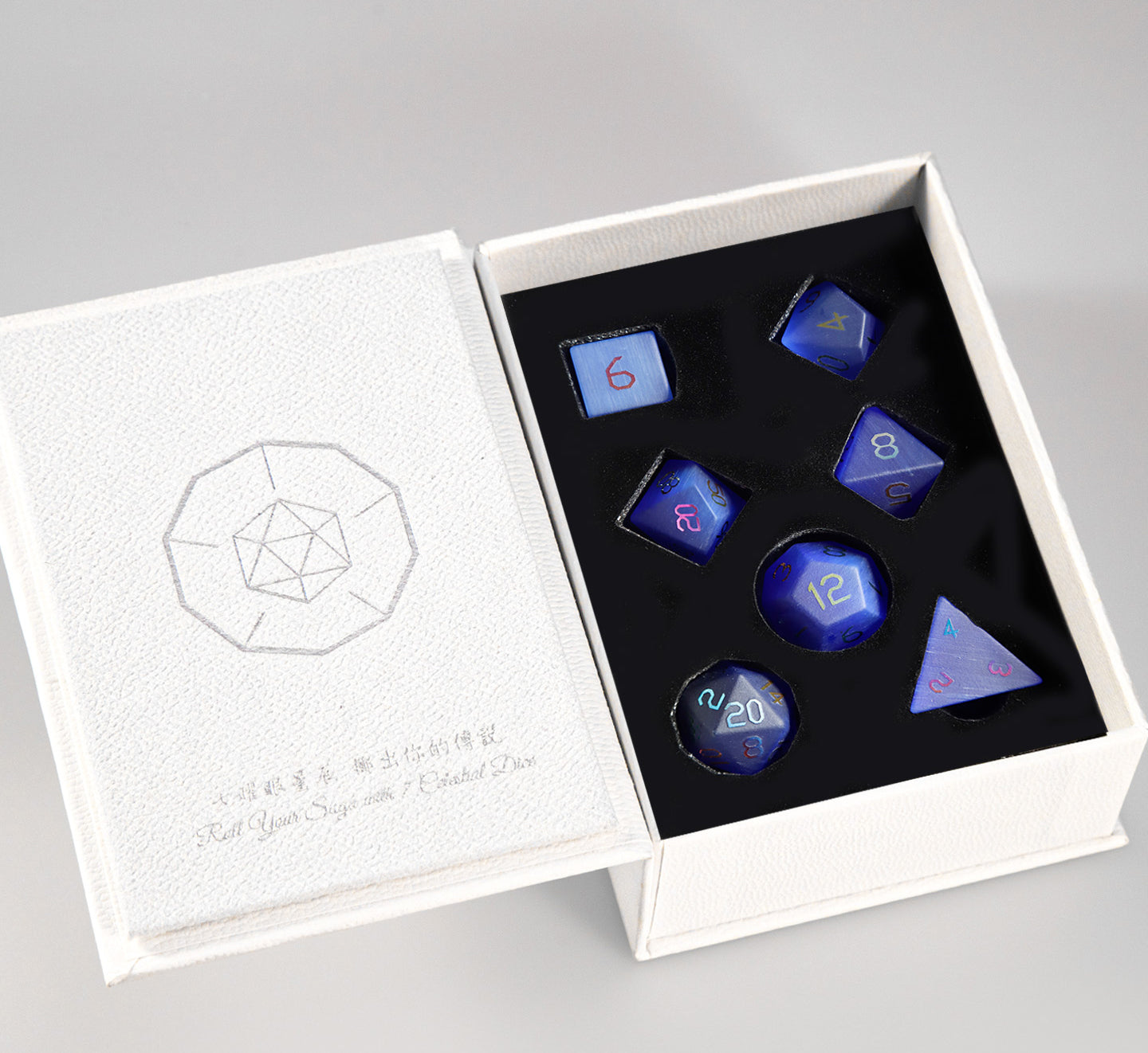 - 7 個の多面体ダイス セット (D4、D6、D8、D10、D8、D12、D20)
