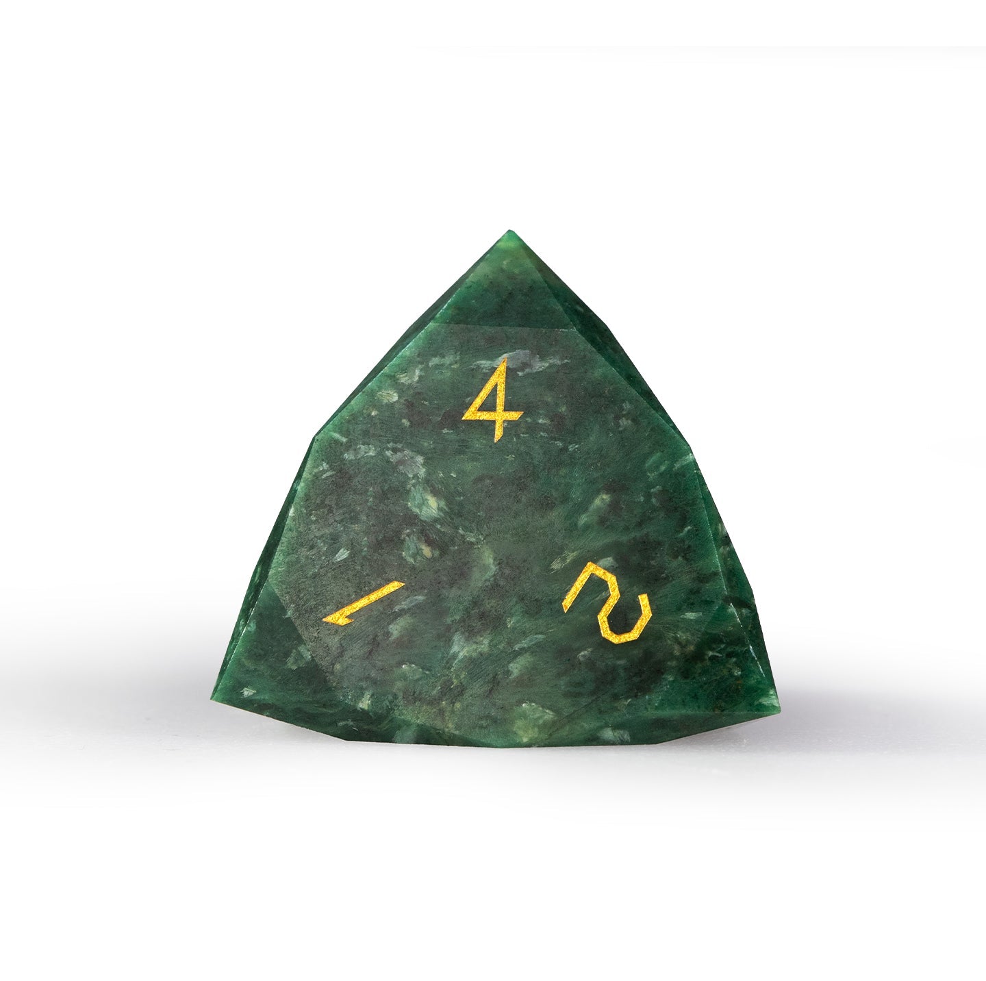 Carved from African jade, this diamond-cut dice set showcases deep natural coloration and refined faceting. The polished stone surface and balanced weight create a grounded, elegant presence—perfect for immersive tabletop adventures.
