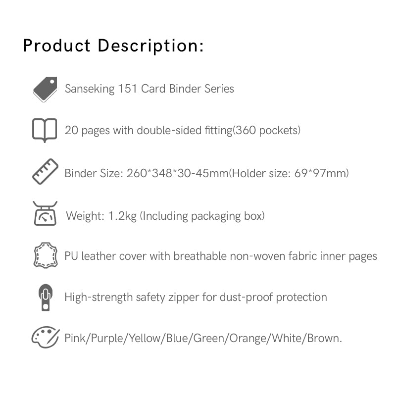Features: Durable PU leather cover with breathable non-woven inner pages; high-strength security zipper for dustproof protection; available in 8 colors: Pink, Purple, Yellow, Blue, Green, Orange, White and Brown.