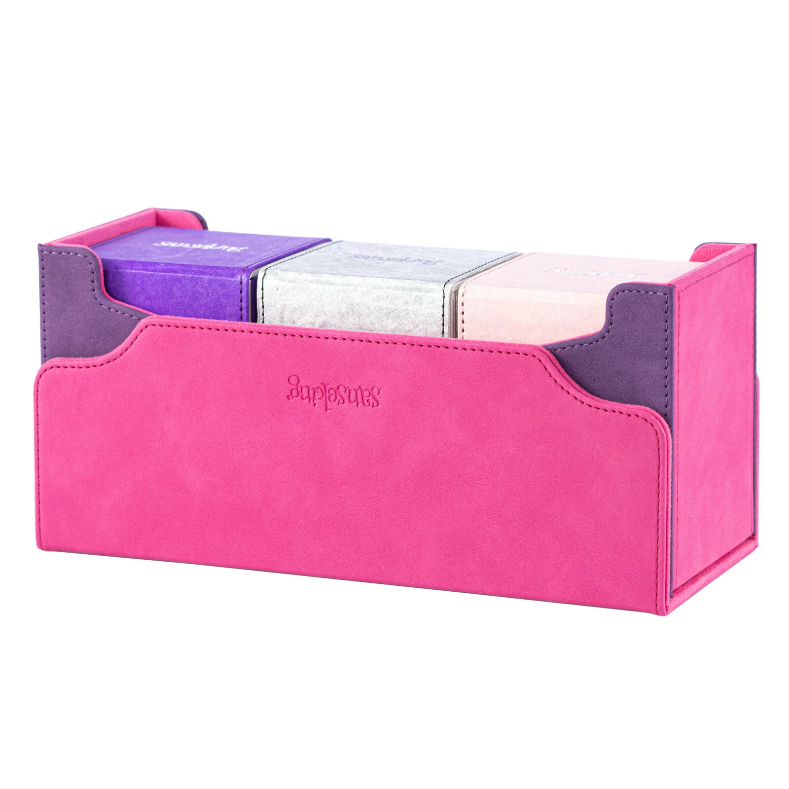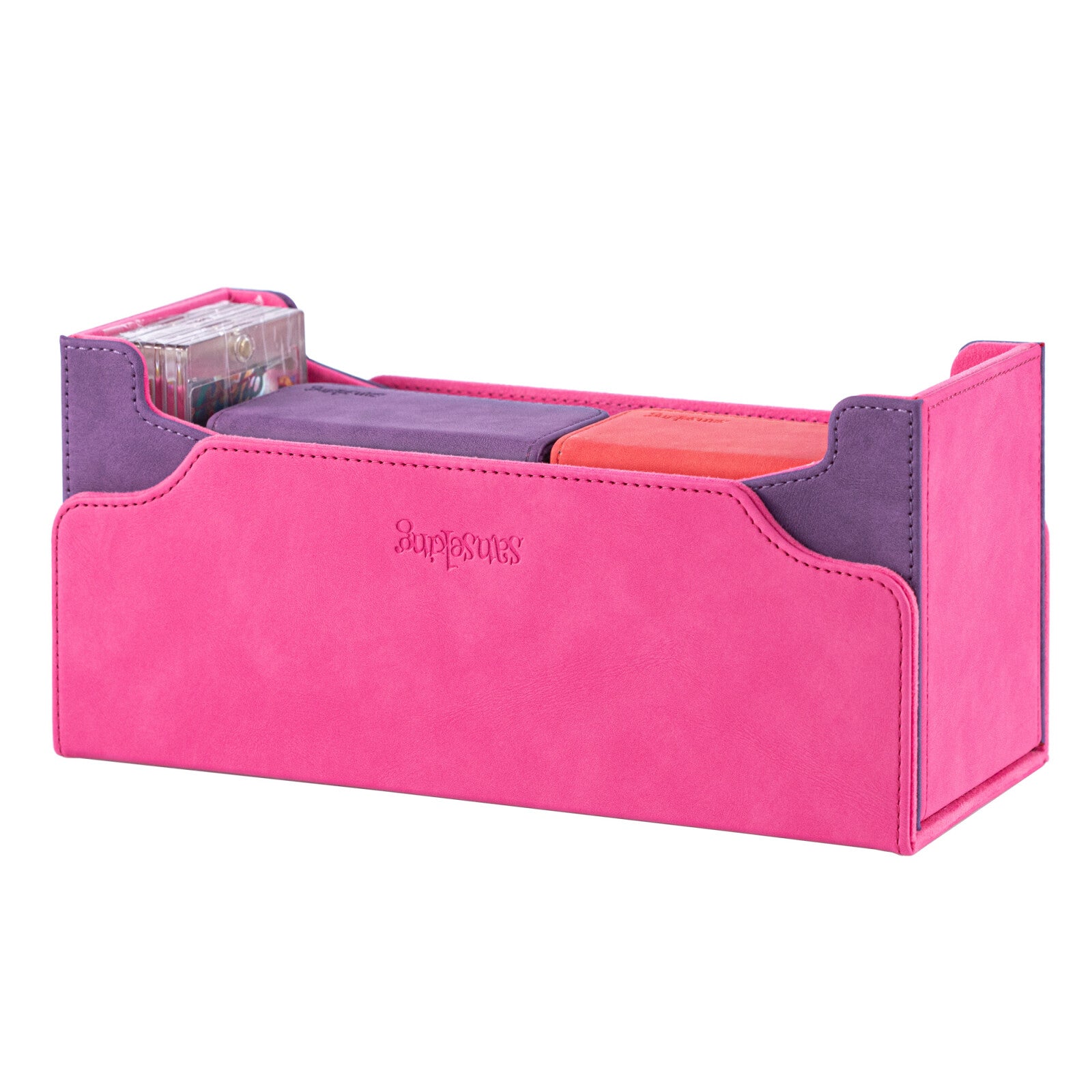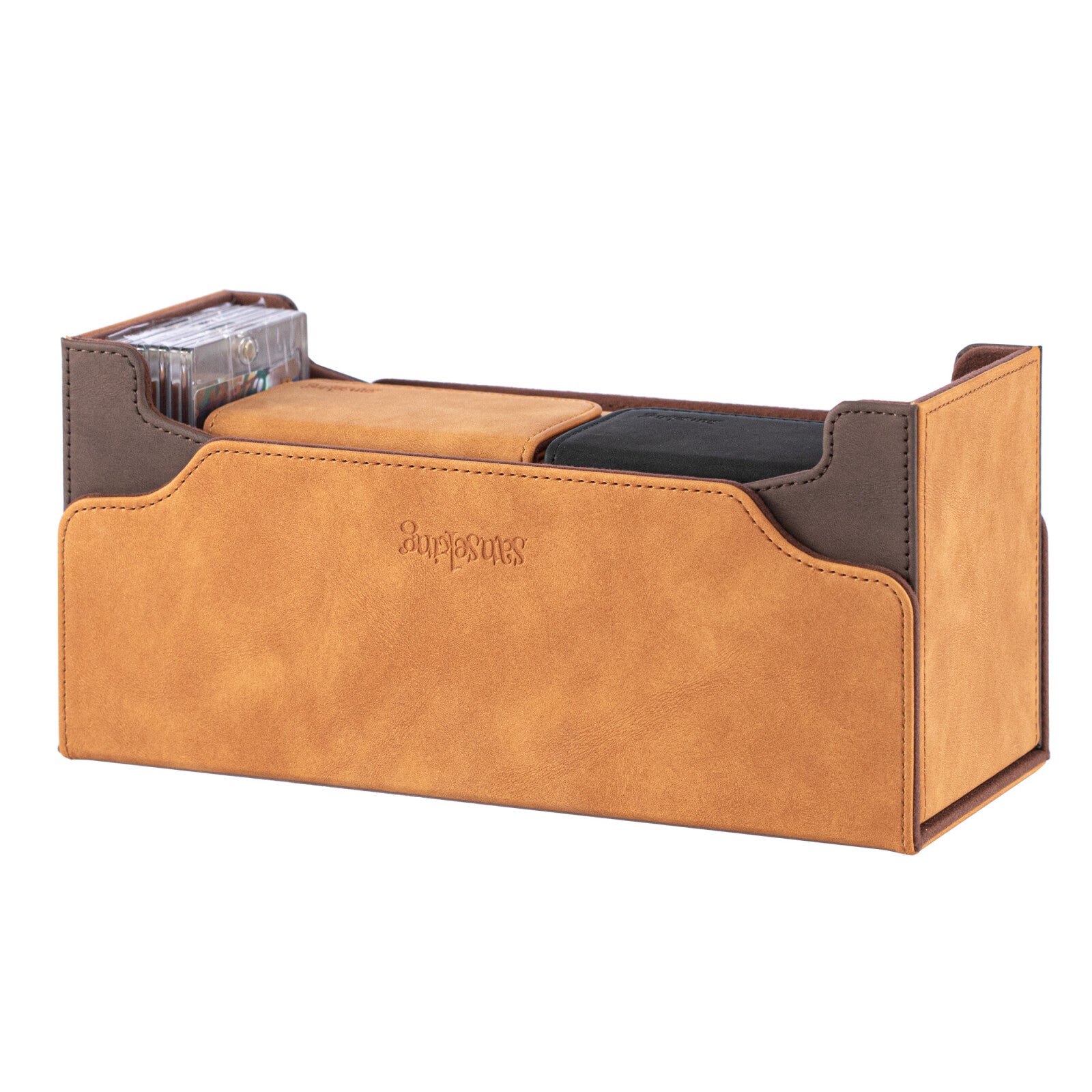All-in-One Storage – Toploader slot, dual 130+ card deck boxes, and 32 magnetic card holders
